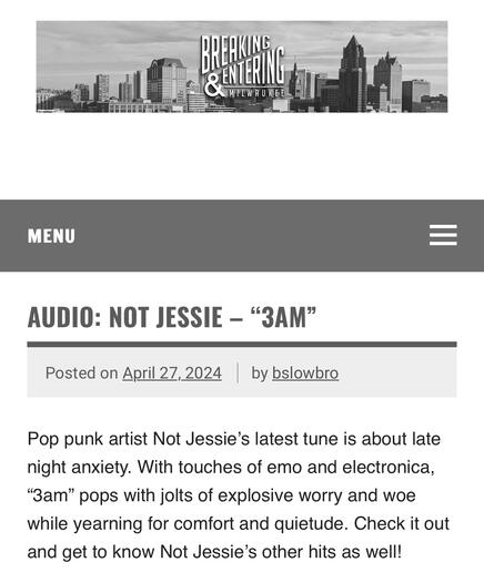 After a lifetime of believing that following dreams wasn't practical or possible, Not Jessie, also known as the "Heartbreak Queen," is finally stepping into the light as a songwriter and artist.Having endured three failed marriages and raising three children, Not Jessie is gradually shedding the limiting beliefs that once held her back. She’s come to realize that the only thing ever standing in the way of her goals was herself. Now, she's eager to inspire others to find their inner joy and stop worrying about the judgment of others.In 2023, Not Jessie began releasing music after being discovered on TikTok by producer Justin Zoltek from Steal Records. While she’s still exploring and refining her multi-genre sound, much of her current music leans towards pop-punk. Ever evolving as an artist, she can’t wait to expand her sound—because, after all, variety is the spice of life!